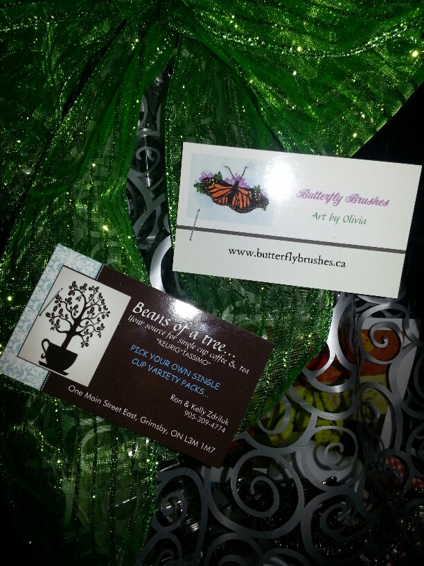 Come by and visit me at the Grimsby Art Festival and you can fill out a ballot to be entered in draw for a Gift basket filled with items such as an “Autumn Still Life card”, various Keurig and Tassimo discs, pewter butterfly measuring spoons and a butterfly cookie cutter all from Butterfly Brushes and Beans of a Tree.