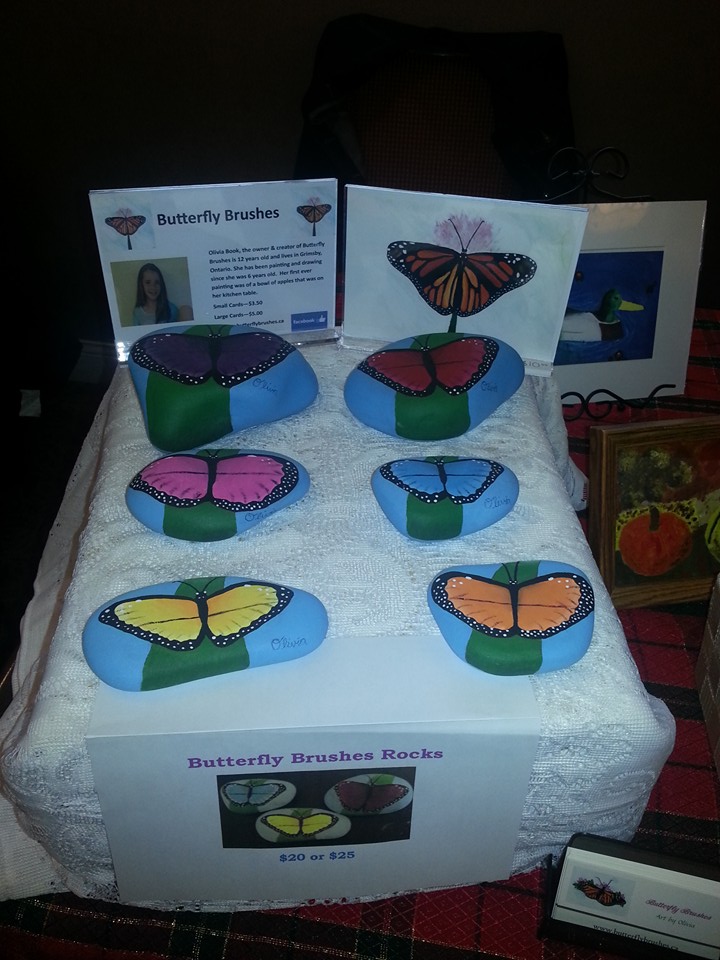 Olivia has been working hard on beautiful painted rocks, a new Monarch butterfly print, also for sale will be Christmas cards and the 2016 Butterfly Brushes calendar.